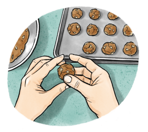 Step 3: Use your hands to form ball shapes, about a 1/2 inch thick, out of the mixture. Place your pumpkin balls on the baking sheet. You'll end up with a good sized batch of treats— about 4 dozen treats total. These will be your “Pepita Pops.”