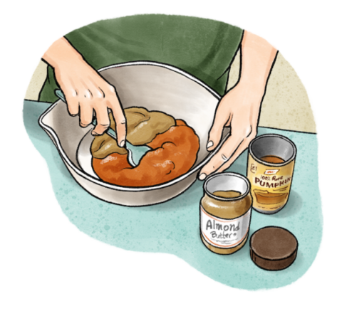 Step 1: Add ½ can of pure pumpkin puree and a ½ cup of almond butter to a mixing bowl. Fold these together until they're fully combined.